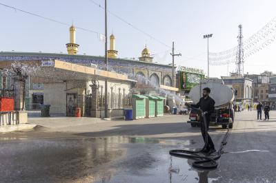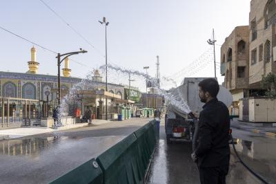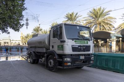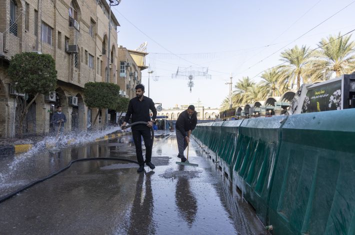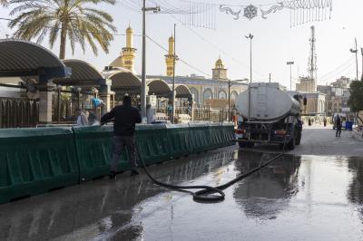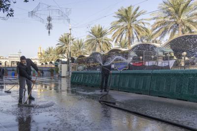 Wahudumu wa kitengo cha utumishi katika Atabatu Abbasiyya wanafanya kazi ya kusafisha eneo lote linalozunguka Ataba tukufu na barabara zinazoelekea Ataba ndani ya mwezi huu wa Ramadhani.