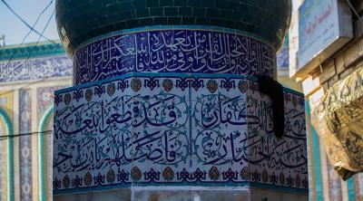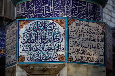 ومن أمام المقام خُطّت الآية الكريمة: بسم الله الرحمن الرحيم (الَّذِينَ إِن مَّكَّنَّاهُمْ فِي الْأَرْضِ أَقَامُوا الصَّلَاةَ وَآتَوُا الزَّكَاةَ وَأَمَرُوا بِالْمَعْرُوفِ وَنَهَوْا عَنِ الْمُنكَرِ وَلِلَّهِ عَاقِبَةُ الْأُمُورِ) صدق الله العليّ العظيم. الحج/41.
