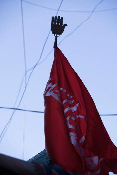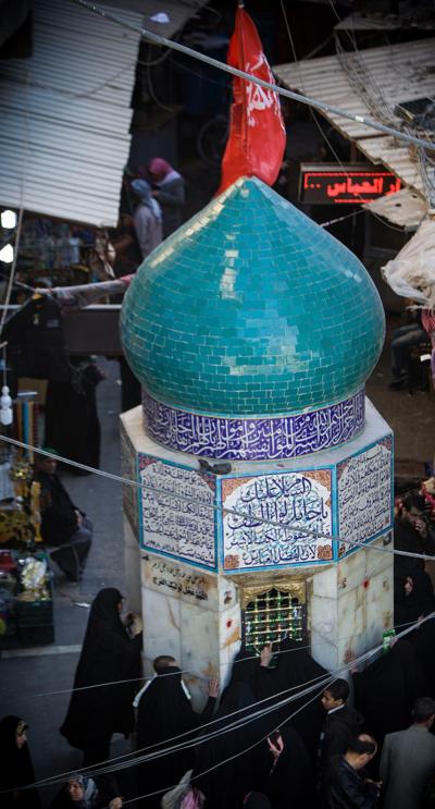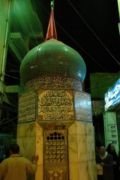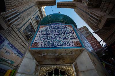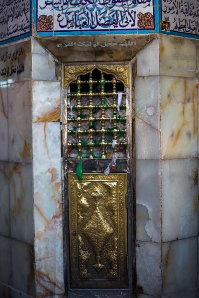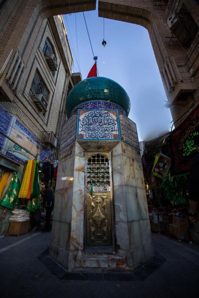 وفي المقدّمة نقشٌ على المرمر (السلام عليك يا حامل لواء الطفّ)، و(مقامُ سقوط الكفّ الأيسر لأبي الفضل العباس عليه السلام)، كما تعلوه قبّةٌ مغلّفةٌ بالكاشي الكربلائي موشّحةٌ بهذه الآية الكريمة: