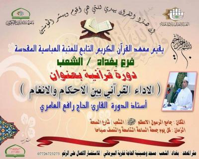 يتواصل معهدُ القرآن الكريم التابع لقسم شؤون المعارف الإسلامية والإنسانية في العتبة العبّاسية المقدّسة بإقامته الدورات القرآنية التخصّصية سواءً التي تُقام في المعهد وفروعه داخل محافظة كربلاء المقدّسة، أو التي تُقيمها فروعُهُ المنتشرة في بعض المحافظات العراقية ومنها فرعُهُ في محافظة بغداد (الشعب)، ومن هذه الدورات دورة الرسول الأعظم(صلى الله عليه وآله) في أحكام تلاوة وتجويد القرآن الكريم بإشراف القارئ الدولي الحاج رافع العامري، وتُقام كلّ يوم جمعة في جامع الرسول الأعظم في نفس المنطقة (الشعب).