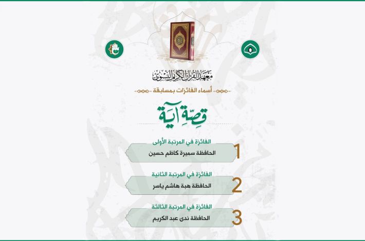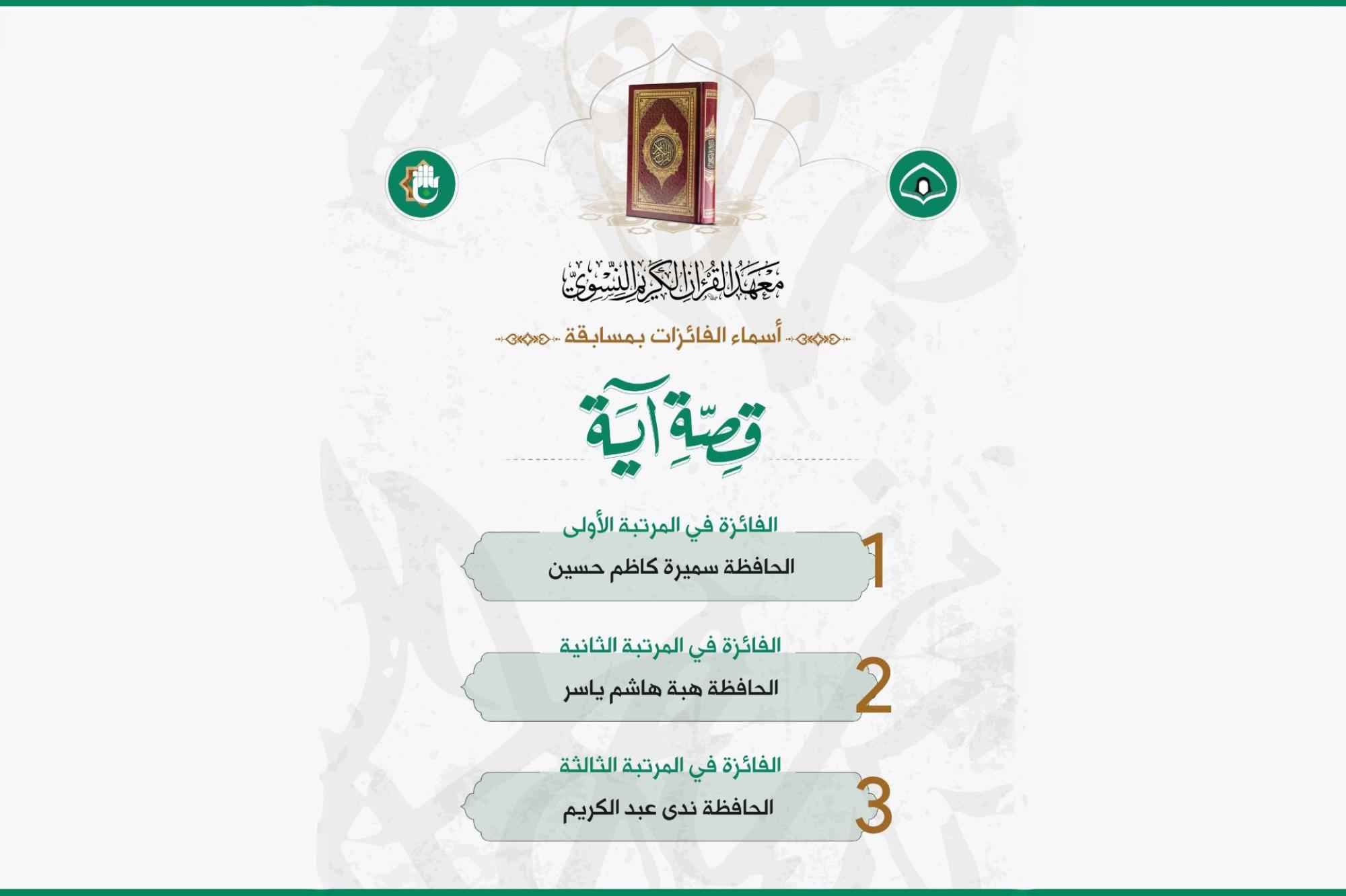 أعلن معهدُ القرآن الكريم النسويّ التابع لمكتب المتولّي الشرعيّ للشؤون النسوية في العتبة العبّاسية المقدّسة، عن أسماء الفائزات بمسابقته القرآنية قصّة آية بنسختها السادسة.