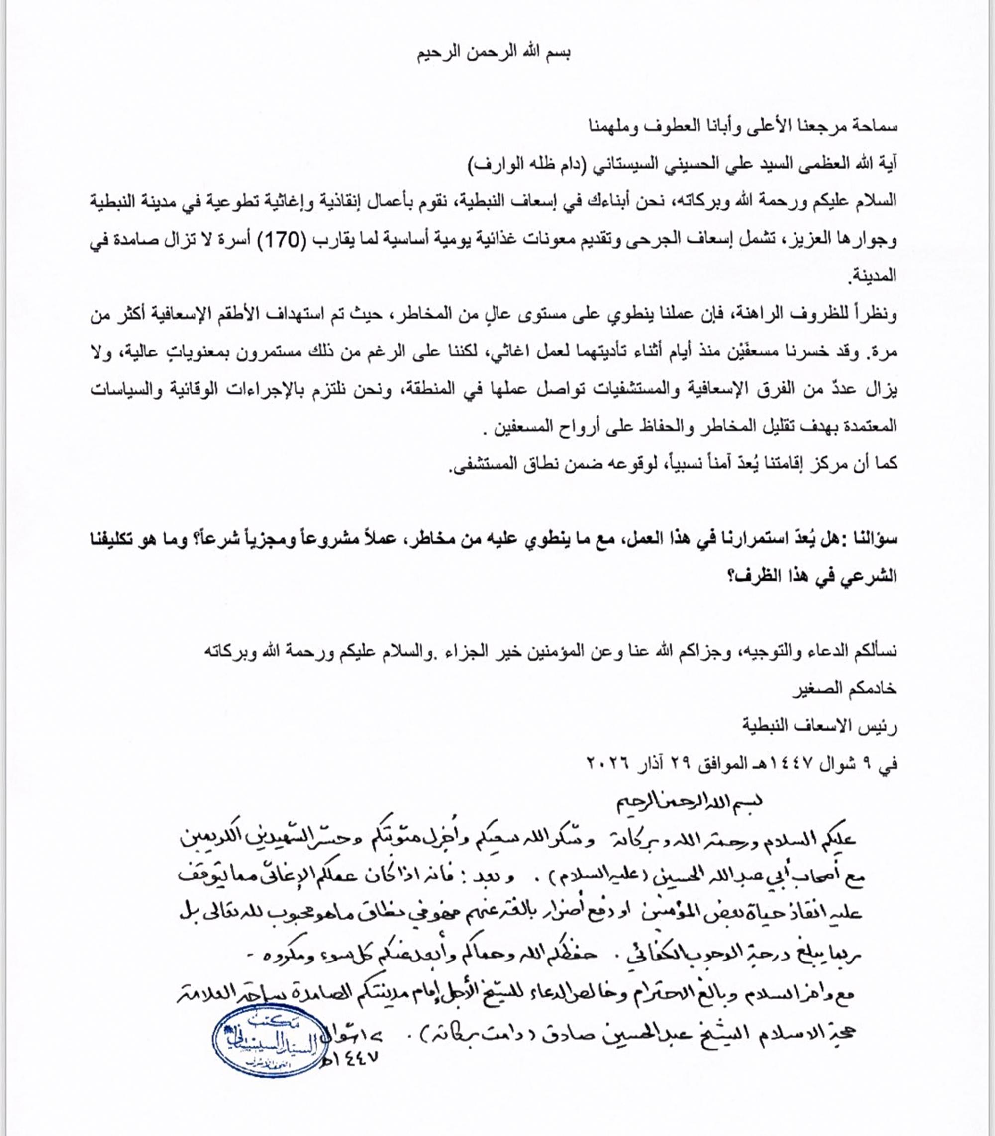أكد المرجع الديني الأعلى سماحة آية الله العظمى السيد علي الحسيني السيستاني (دام ظله)، أنّ عمل إسعاف النبطية جنوب لبنان الإغاثي ربما يبلغ درجة الوجوب الكفائي.