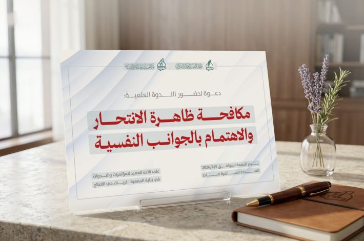 دعت جمعية العميد العلمية والفكرية الباحثين والمختصين إلى المشاركة في ندوتها العلمية التي ستعقد بعنوان: (مكافحة ظاهرة الانتحار والاهتمام بالجوانب النفسية).