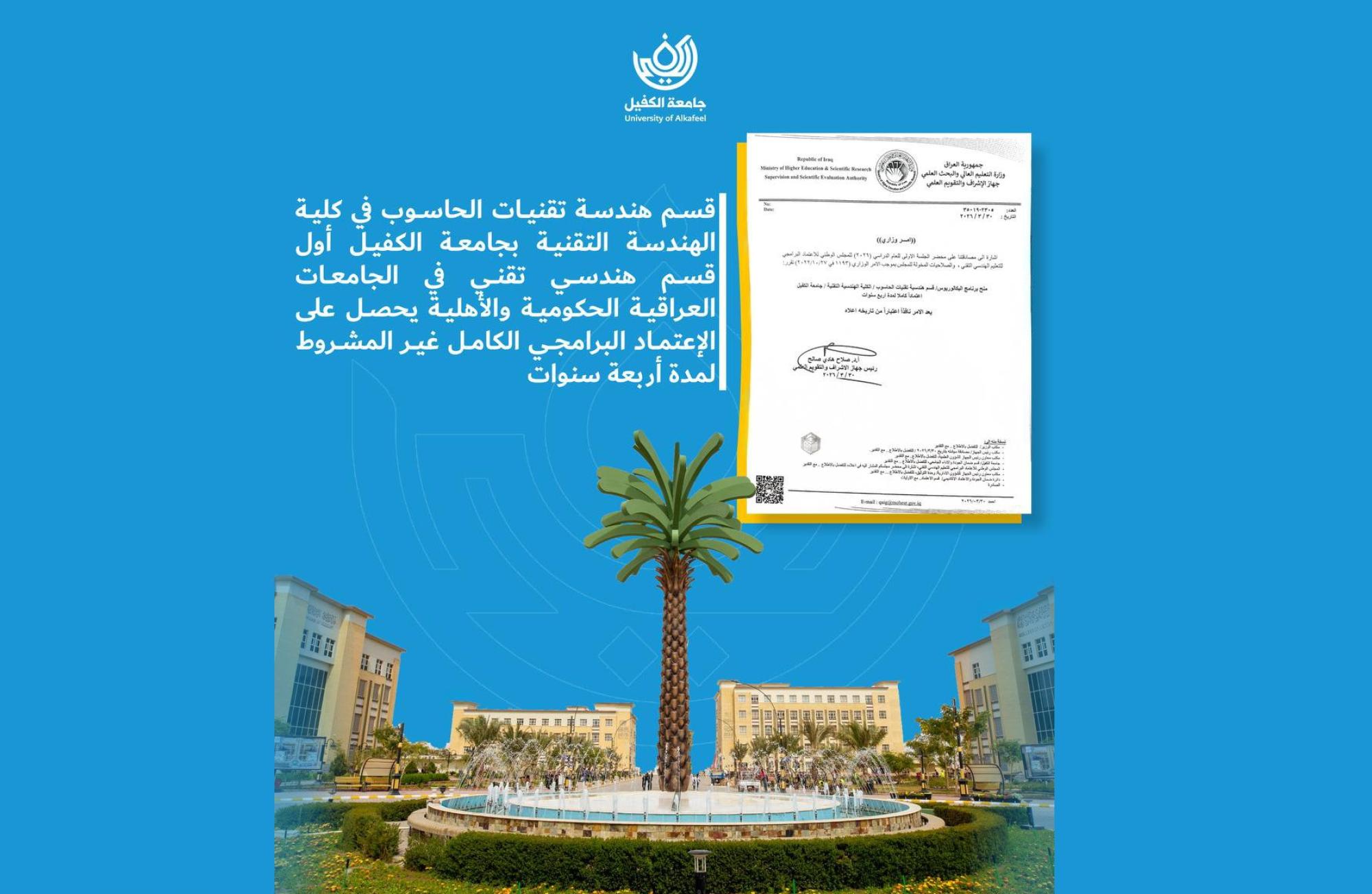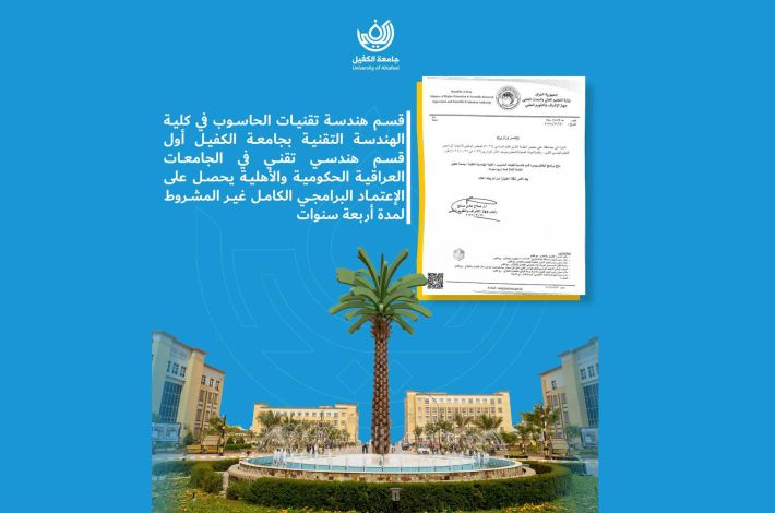 حقّق قسم هندسة تقنيات الحاسوب في كلية الهندسة التقنية بجامعة الكفيل إنجازًا أكاديميًّا في الحصول على الاعتماد البرامجيّ الكامل غير المشروط لمدّة أربع سنوات.