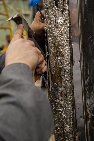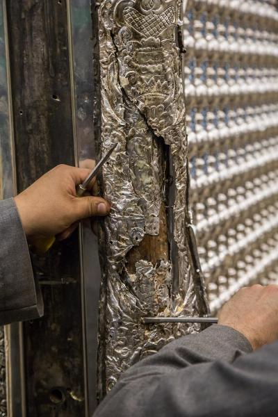 يُذكر أنّ أعمال تفكيك الأجزاء المعدنيّة المركّبة على الهيكل الخشبي تكون حسب كلّ قطعة، مع الأخذ بنظر الاعتبار المحافظة عليها من أيّ ضررٍ قد يحصل نتيجة أعمال التفكيك لكون أنّ الأجزاء قديمة وبعضها متآكل، فضلاً عن طريقة تركيبها البدائية فهي مثبّتة بقوّة بواسطة مسامير خاصّة، ليتمّ بعدها ترقيمُها بكودات رقميّة خاصّة بحسب كلّ قطعة، بعدها تغلّف بشرائط بلاستيكية وقطعة قماشية وتوضع داخل صناديق صُنعت وفقاً لقياس كلّ جزءٍ وقطعة، ويوضع رقمٌ وكود آخر على الصندوق ليتمّ نقلها بعد ذلك الى مخازن العتبة المقدّسة من أجل إجراء أعمال صيانةٍ لها تمهيداً لعرضها في متحف العتبة المقدّسة.