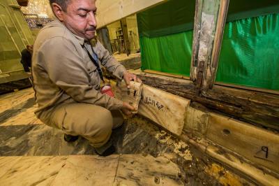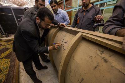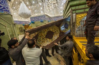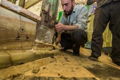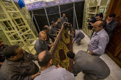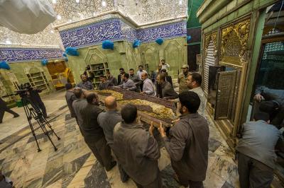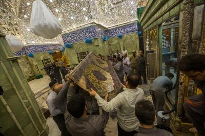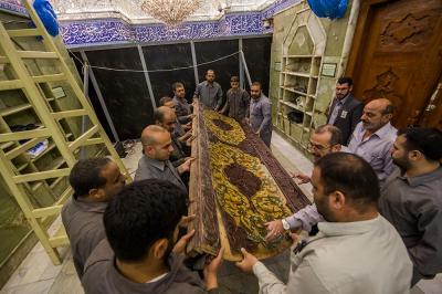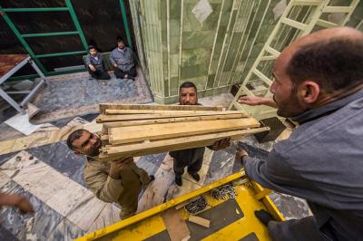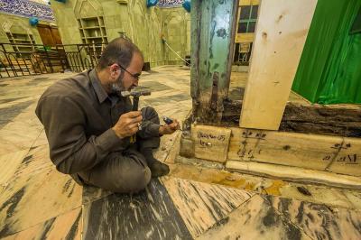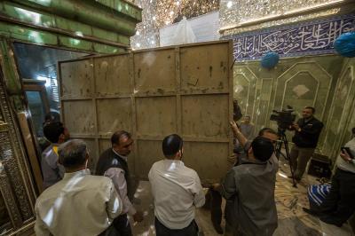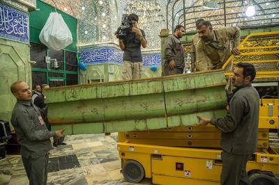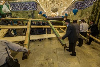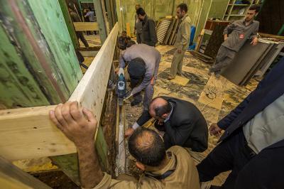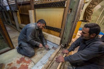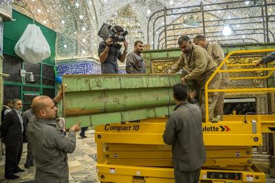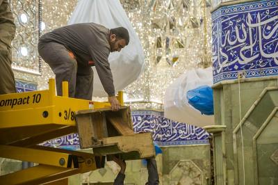 In preparation for the installation of the shrine's new grid of Aba Al-Fadl Al-Abbas (Peace be upon him), which was manufactured with pride in the factory of the Al-Abbas's (p) holy shrine for the manufacture of shrines' grids by the hands of the employees of the holy shrine, the technical staffs working on dismantling the shrine's old grid of Aba Al-Fadl Al-Abbas (peace be upon him) announced that works are continous depending on the plan drawn up by the committee supervising these works to dismantle the grid's wooden structure.