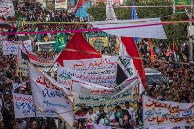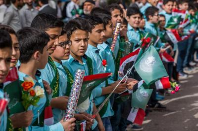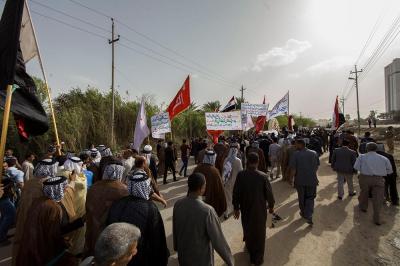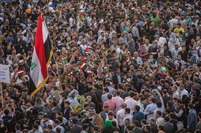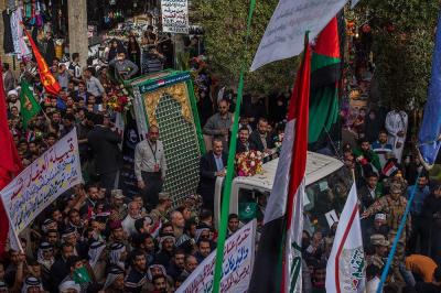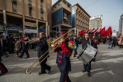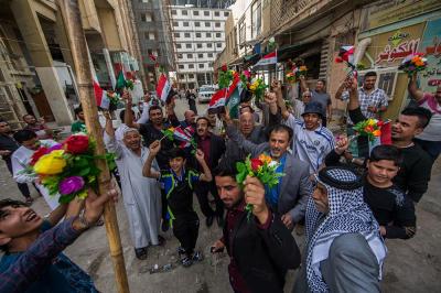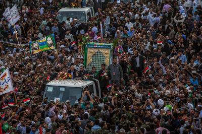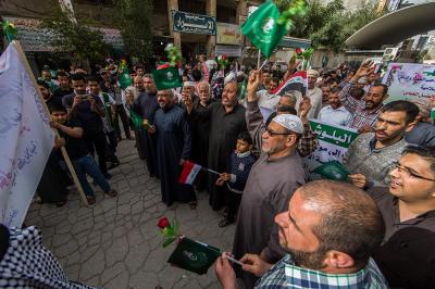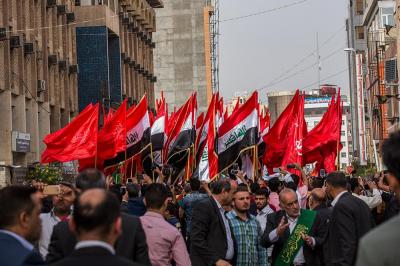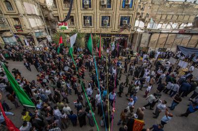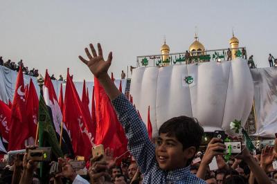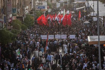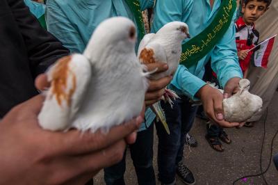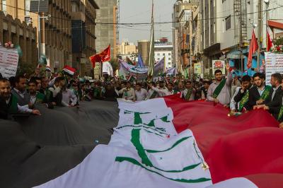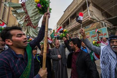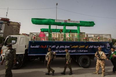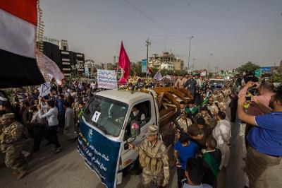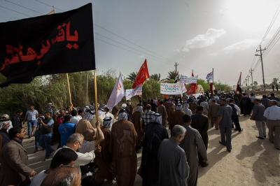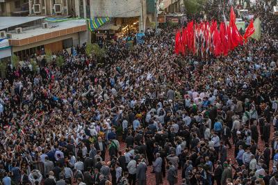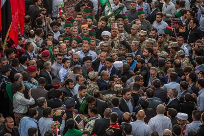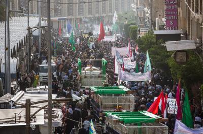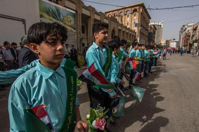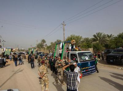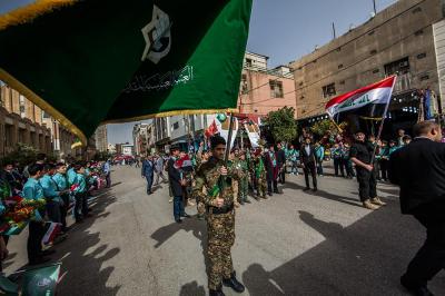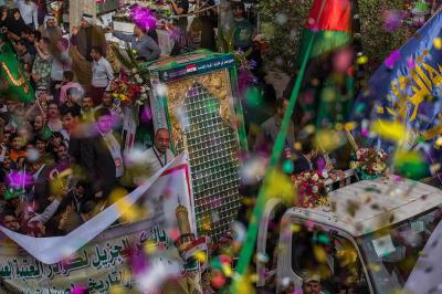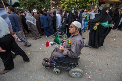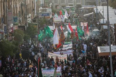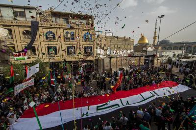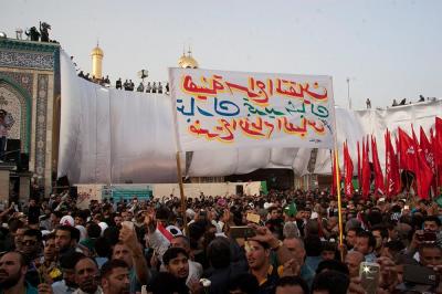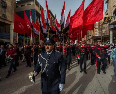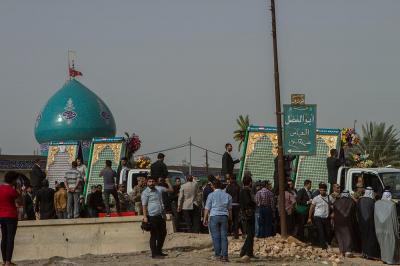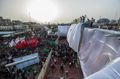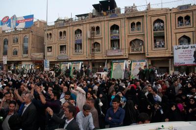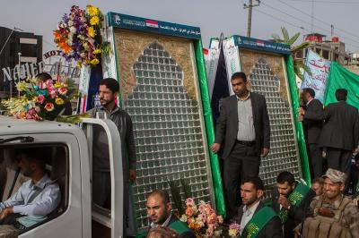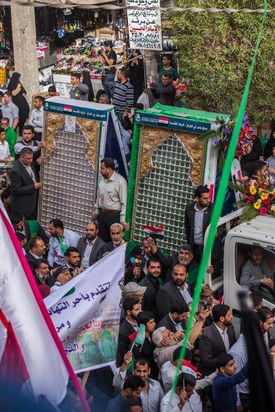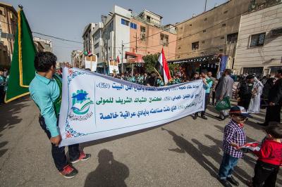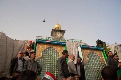 À la tête du cortège, les drapeaux ( ya Qamar Hachim) et le drapeau national irakien chantant des poèmes, et des chants populaires pour Abbas (p). Passant par la Porte de Bagdad où une très grande foule attendait pour jeter les fleurs et bonbons, et accomplir les sacrifice tout au long de la route jusqu'à la Porte de la Qiblah l'Imam Hossein (p), ensuite dans la Zone d'Entre al-Haramayne, et enfin l'Entrée Abou fadhl al-Abbas(p) où se joint une autre foule voulant la bénédiction de ce beau cortège. Le discours de Sayed Safi à cet occasion
