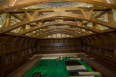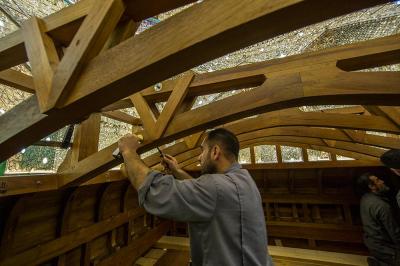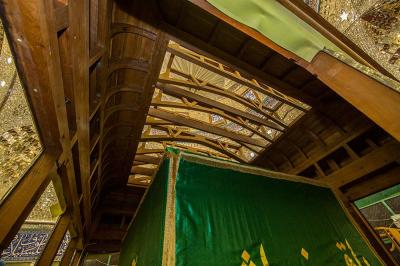 يُذكر أنّ الخشب المُستَخدَم هو خشب الصاج البورمي الذي يمتاز بعدّة ميزات منها مقاومته للظروف البيئية المختلفة من رطوبة وغيرها، ودرجة تحمّله العالية للأحمال والأثقال، وعدم تعرّض حشرة النمل الأبيض له "الأرضة" وغيرها، حيث تمّ تشكيل الخشب الخام وتقطيعه وفقاً لأبعاد الهيكل وباستخدام آلاتٍ ومكائن خاصّة تمّت تهيئتها لهذا الغرض وبإشراف كادرٍ فنيّ، حيث تمّ تقطيعه وإجراء العمليات الفنّيّة والهندسية وفقاً للقياسات المطلوبة، وإنّ سُمْك ومتانة وحرفيّة العمل بهذا الهيكل بلغت أضعاف ما عليه الهيكل القديم.