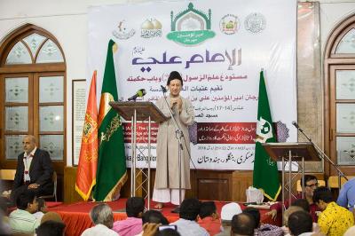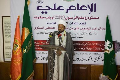 افتتاحی تقریب کا آغاز تلاوت قرآن مجید سے ہوا جس کے بعد عراق کے مقدس روضوں کی نیابت میں روضہ مبارک حضرت عباس علیہ السلام کے دینی امور کے سیکشن سے تعلق رکھنے والے شیخ علی اسدی نے خطاب کیا اور حاضرین کو حضرت امیر المومنین علی بن ابی طالب علیہ السلام کے جشن میلاد پہ مبارک باد پیش کی اور عراق کے مقدس روضوں میں کام کرنے والے خدام کی طرف سے سلام اور نیک تمنائیں پہنچائیں۔
