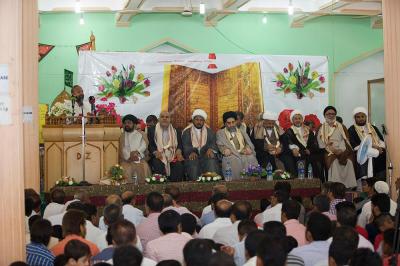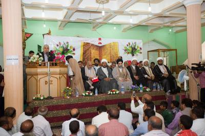لتعتلي بعدها الوفود منصّةً وُضعت داخل حرم الحسينيّة لإلقاء الكلمات فكانت هناك كلمةٌ للسيد علي رضا وهو إمام جماعة في المدينة وأحد أعضاء مؤسّسة الجعفرية للبلاغة بيّن فيها: "إنّه لافتخار كبير أن نجتمع اليوم مع وفود عتبات العراق المقدّسة، وهي لفرصة كبيرة مُنحت إلينا، وإنّ العراق وأهل العراق لم يغبْ عن بالنا ومخيّلتنا في جميع الأوقات والصعاب والمحن التي عاشها، فنذكره بالدعاء وبالأخصّ هذه الأيّام وهو يتعرّض لهجمة بربريّة من قبل عصابات داعش الإرهابية".بعدها قام الشيخ علي الأسدي لإلقاء كلمة وفود العتبات المقدّسة التي ممّا