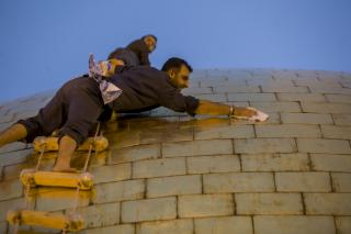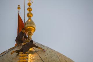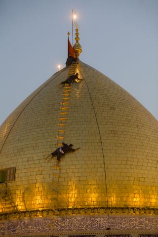 The Department of the care of the holy sanctuary at the Al-Abbas's (p) holy shrine has started cleaning the holy dome of the sanctuary of Aba Al-Fadl Al-Abbas (Peace be upon him) from the outside, according to the plan set by the department in line with the weather conditions and climate fluctuations that may affect the gloss and glamor of the golden tiles that cover the holy dome, to perpetuate them and to show them in the most beautiful and radiant way befitting the sanctity of the holy shrine.