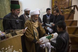 “Bu ödül ziyareti Babil eyaletinin Şomelî kazasındaki 14 Halk Seferberliği şehîdinin ailesini kapsamıştır. Onlar için Hz. İmam Muctebâ (O'na selâm olsun) Müessesesi işbirliği ile şehirdeki mescitlerden birine ziyaret düzenlendi.”