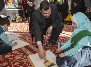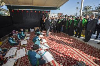La cérémonie d’ouverture qui a été suivi par un certain nombre de responsables du sanctuaire saint et des visiteurs, a commencé par une lecture de quelques versets du saint Coran, puis une conférence religieuse par Cheikh Amer Al-Karbalai du département des affaires religieuses dans le sanctuaire saint, dans laquelle la biographie de Sayeda Azzahra (paix sur elle) et ce qu’elle a endurée de calamités et malheurs après la mort de son père le Messager d’Allah (prière de dieu et paix soit sur lui et sa famille), et après le Radoud Al-Husseini a récité une Marthiya Husseiniya (un chant religieux ) sur les douleurs de Sayeda Azzahra (paix sur elle). La cérémonie a inclus un atelier de dessin libre pour les écoles Al-Amid dans lequel les enfants ont dessiné des représentations du chagrin et blessures qu’à subit Sayeda Azzahra (paix sur elle).