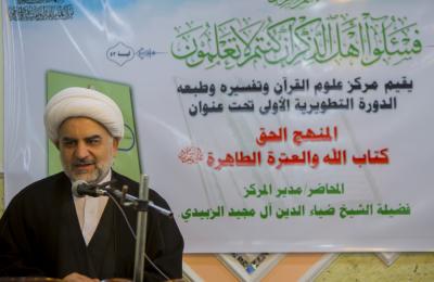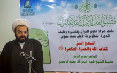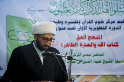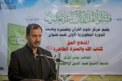 جاء ذلك خلال الكلمة التي ألقاها في حفل ختام الدورة التطويريّة الأولى التي أقامها مركز علوم القرآن وتفسيره وطبعه في معهد القرآن الكريم التابع للعتبة العبّاسية المقدّسة يوم الخميس (8ذي الحجّة 1438هـ) الموافق لـ(31آب 2017م) والتي استمرّت لخمسة أيّام، واشترك فيها جمعٌ من المختصّين والمهتمّين في مجال البحث القرآني وكانت بعنوان: (المنهج الحقّ كتاب الله والعترة الطاهرة عليهم السلام).