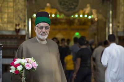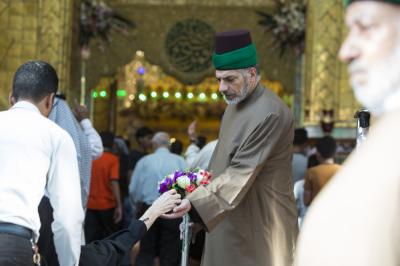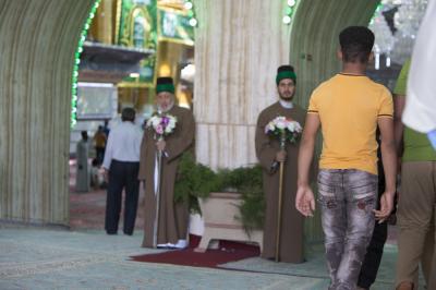 Die ehrenwerten Mitarbeiter trugen ihre traditionelle Kleidung und stellten sich an den Eingängen zur heiligen Stätte und dem reinen Hof von Abu Fadl al Abbas (As) auf, während sie mit Blumen verzierte Zepter trugen, als Symbol des Friedens und der Nächstenliebe.