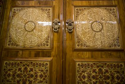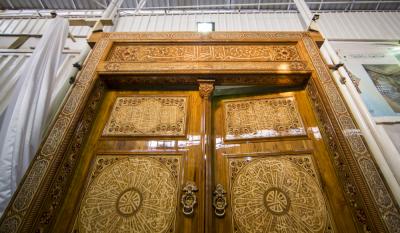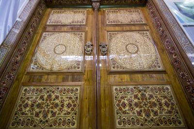 9- استخدم في صناعة هذا الباب خشب الساج البورمي حيث تم استخدام 130 فوتاً مكعباً منه.