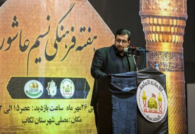 واختتم " واقعة عاشوراء حادثة استثنائية وان شاء الله يشاهد اهالي مدينة تكاب من خلال هذا المهرجان تفاصيل تلك الفاجعة، من جانب آخر فان هذه النهضة الخالدة كان لها الاثر الكبير في تحرر الشعوب باختلاف مشاربها الدينية والعرقية".