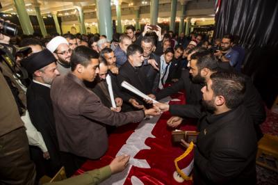 اعقبتها كلمة اخرى القاها إمام جماعة اهل السنة والجماعة في مدينة تكاب الشيخ مرادي بيَّن فيها قائلا: "ان التبرك اسم جامع وهو دليل على ثبات النعم، ومنها قولنا اللهم بارك على سيدنا محمد (صلى الله عليه واله سلم) اذ يقول احد علماء السنة عن تفسيرها: ثبّت عليه ما اعطيته من مقام مشرف وكمال بكل شي ، والتبرك هو طلب الكمال الذي اودعه الله سبحانه وتعالى في ذلك الشيء، من هنا فان التبرك بمراقد الاولياء والصالحين انما هو تقرُّب الى الله تعالى ولا شكَّ ان الاضرحة المشرفة لاهل البيت (عليهم السلام) مصداق واضح على ذلك، فهي مأمن للقلوب وشفاء للانفس التي اصابتها الشوائب نتيجة مغريات الحياة".