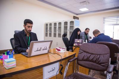 Somit wurde für jede Fakultät ein spezieller Empfangbereich für die Studenten eingerichtet und mit speziellem Personal ausgestattet, um die Daten des elektronischen Formulars einzugeben und die Anmeldeverfahren zu vereinfachen und das am Standort der Universität, welcher unter folgender Adresse zu finden ist: Provinz Karbala, Beginn des Weges Karbala-Nadschaf, in der Nähe der Säule nr. 1238.