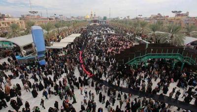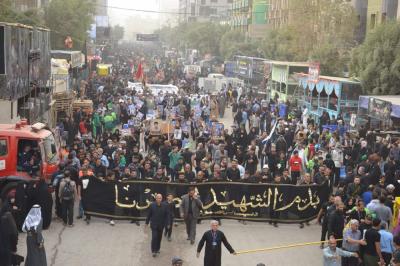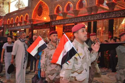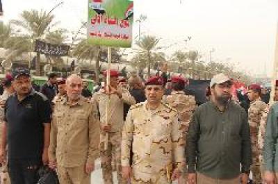 La marche a commencé portant la bannière en plus des posters des martyrs de la province des forces de sécurité et de la mobilisation populaire, de la bibliothèque centrale jusqu’au sanctuaire saint Al Hussein, puis le sanctuaire saint Al Abbas passant par la place entre les deux sanctuaires saints.