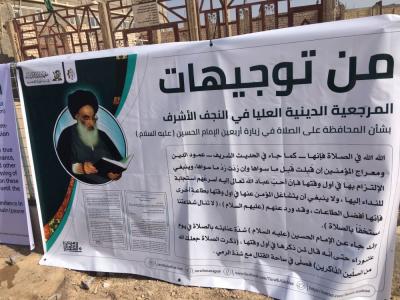 The Institute of the Heritage of the Prophets for the e-Hawza Studies of the Department of Intellectual and Cultural Affairs at the al-Abbas's (p) holy shrine publishes hundreds of educational and orientation poster for the visitors on all the main roads leading to the holy city of Karbala, as part of its plan for the Ziyarat Arba'een in three languages (Arabic, English and Persian) in beautiful designs and with a clear font and attractive colors that attract the visitors to read them.