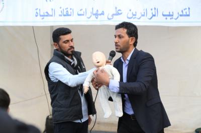 The camp aims to teach the visitor the skills of cardiopulmonary resuscitation, the situation of rescuing the child from cases of suffocation that may be exposed to him, in addition to how to deal with wounds, burns, fractures and dealing with emergency situations that may happen within the family or friends or in public life.