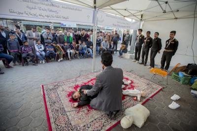 The coach Ali 'Awdah Wahid explained the following: "Every Thursday of every week a first aid camp is held, where visitors are taught how to deal with some cases that may happen without hesitation or fear. The camp teach first aids for the following problems: (Treatment of burns, wounds, fractures, pulmonary resuscitation, and firefighting). The training includes all age groups. "