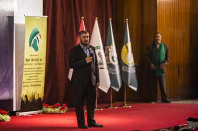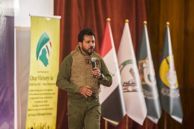 After the national anthem was played to announce the beginning of the ceremony, it began by the recitation of verses from the Holy Quran and reading Surah Al-Fatiha in memory of the martyrs of Iraq. Then the welcoming speech was delivered by Mr. Maitham Al-Zaidi, the supervisor of the fighting squad of al-Abbas (peace be upon him) stating: "We have the honor to be among you today on the occasion of the decisive victory that the Iraqis have drawn with their blood and jihad. Many say that we often repeat the word of "victory of Iraq", we tell them in the sermon of victory of the supreme religious authority, Sayed Ali al-Sistani, he mentioned this expression eleven times, and every nation and people in the world have the right to be proud of their patriotism, country, heritage and civilization. We do not believe that there is a country that possesses the foundations of our country Iraq. Iraq is the greatest and oldest civilization of humanity, and we have taught to the world how to express through writing. And our lad was the land of Prophets and righteous. And now, you see that Iraq has achieved the heroic epic through the blood of its martyrs by fighting ISIL, this calamitous beast that was not targeting Iraq as a final point, but wanted Iraq to be its starting point to the rest of the countries, but thanks to the blood of the martyrs ISIL was eliminated and Iraq and the entire region was liberated. "