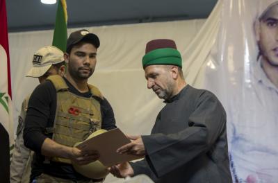La cérémonie de clôture de la session a débuté par la récitation de versets du Saint Coran et par le discours prononcé par le Cheikh Aqeel Al Aboudi du Département des Affaires Religieuses au nom du sanctuaire saint Abbasside, dans lequel il exhortait les participants à tirer profit de ces cours et à les traduire pratiquement sur le terrain. Le fait que l'acquisition de compétences médicales et la façon de traiter avec les blessés pendant le combat est important et nécessaire que chaque combattant doit être conscient d’avoir et aussi important que l'importance d'autres tâches de combat.