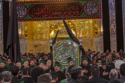 حيث انطلق الموكب الذي يتقدمه النعش الرمزي من صحن ابي الفضل العباس (عليه السلام) مرورا بساحة مابين الحرمين الشريفين ، واثناء المسير صدحت حناجر الموالين بالهتافات والقصائد التي جسدت مشاعر الحزن وهول هذه الفاجعة الاليمة والمصاب الجلل ، وعند وصولهم لصحن سيد الشهداء ابي عبد الله الحسين ( عليه السلام ) كان في استقبالهم اخوتهم من خدام العتبة الحسينية المقدسة ، ليُعقد في الصحن الحسينيّ الشريف مجلس عزاء (لطم) أُلقيت خلاله العديد من القصائد والمراثي التي أظهرت مظلومية الامام الكاظم ( عليه السلام ) .