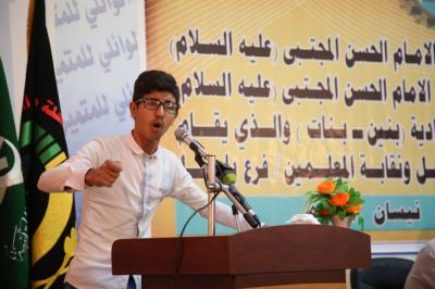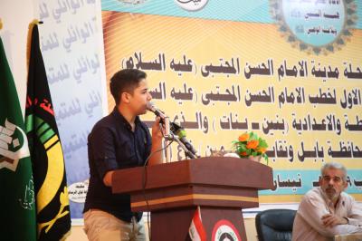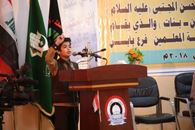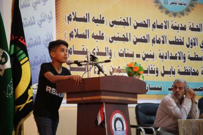 Sous les auspices du sanctuaire saint Al Abbas et en continuité de ses projets intellectuels visant à revivre les actes des imams d’Ahl Al Bayt (p), a été lancé le dimanche matin 28 Rajab 1439 AH correspondant au 15 Avril 2018 les activités du premier festival des discours de l’imam Al Hassan (p), organisé par le haut comité du projet Al Hilla ville de l’imam Al Hassan Al Mojtaba (p) des écoles primaire et secondaire et collège, en collaboration avec la direction de l’éducation et le syndicat des enseignants dans la province de Babylone sous le slogan : (Imam Al Hassan Al Mojtaba (p) un don du prophète (Ppsl) et l’éloquence (p)).