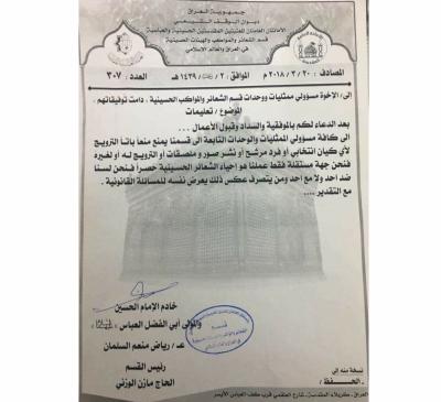 الى كافّة مسؤولي الممثّليات والوحدات.. يُمنع منعاً باتّاً الترويج لأيّ كيانٍ انتخابيّ أو فردٍ مرشّح أو نشر صورة وملصقات أو الترويج له أو لغيره، فنحن جهةٌ مستقلّة عملُنا فقط هو إحياء الشعائر الحسينيّة حصراً، فنحن لسنا ضدّ أحد ولا مع أحد، ومن يتصرّف عكس ذلك يعرّض نفسه للمساءلة القانونيّة.