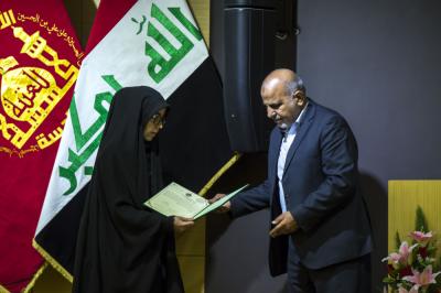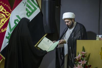 The honoring ceremony was held in the hall of Imam al-Hassan (peace be upon him) in the al-Abbas's (p) holy shrine, and after the recitation of verses of the Holy Quran and reading Surat al-Fatiha in memory of the martyrs of Iraq, there was a speech of Sayed Adnan al-Mosawi in the Department of Religious Affairs in which he congratulated the winners commending the efforts harnessed by the teachers in the Quranic Women Institute to create an aware generation of Quran, indicating the need to stick to the book of the Almighty God, inviting the winners to exert more efforts to continue learning, understanding and applying the teachings of the Holy Quran.