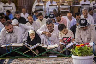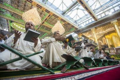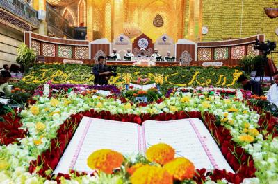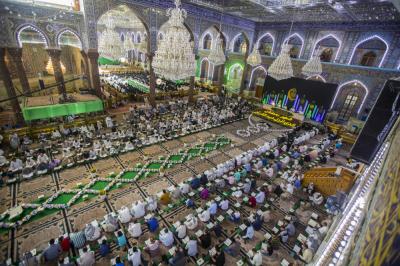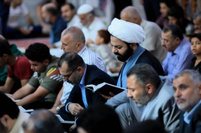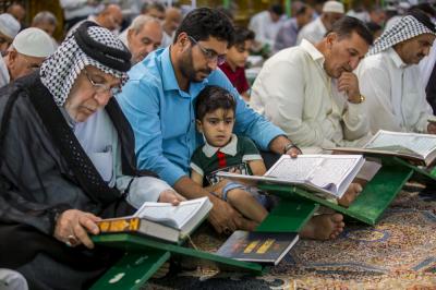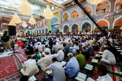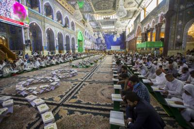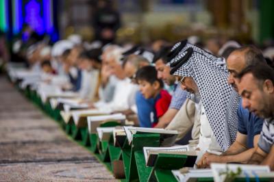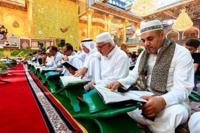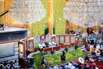 Jeden Mittag begeben sich die Gläubigen in die Heiligtümer von Imam Hussein und seinen Bruder Abu Fadl al Abbas (Friede sei mit ihnen), um eine der wichtigsten Gottesdienste in diesem heiligen Monat zu vollziehen und an den Koranrezitationen in den beiden Höfen teilzunehmen, die zu den wichtigsten Programmpunkten der heiligen husseinitischen und abbasitischen Stätte zählen und inmitten einer religiösen und spirituellen Atmosphäre stattfinden, die den Menschen in Ehrfurcht steigen lassen.