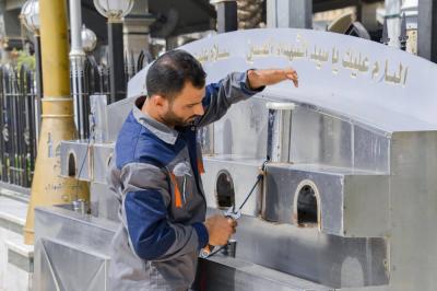 Continuant : « L'aspect service, qui est l'une des choses les plus importantes qui assurent notre département et a participé à un certain nombre de division, y compris des véhicules, qui transporte les déchets, la fournir d'eau fraîche en plus des véhicules de nettoyage, la division d'électricité répare le système d'électricité et les pannes, le département des climatisations qui travaille à travers la supervision continuelle et surveillance des dispositifs de refroidissement dans la zone entre les deux sanctuaires saints pour tempérer l'atmosphère pour les visiteurs, la division de sécurité et de service travaille sur la surveillance, et le département a mis en place des lieux pour le rituel des nuits d'Al Qadr en plus de la célébration de l'anniversaire de naissance de l'imam Al Hassan (p), et les employés fournissent des jus aux visiteurs quelques heures avant la rupture du jeune ».