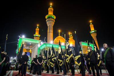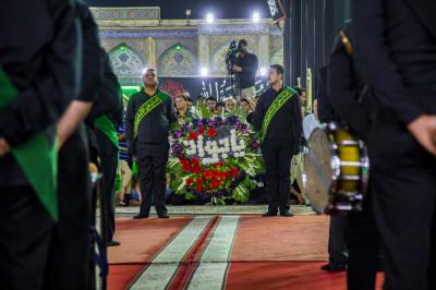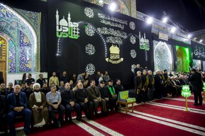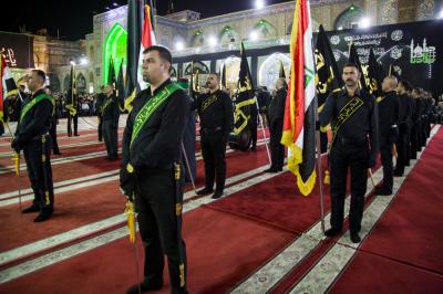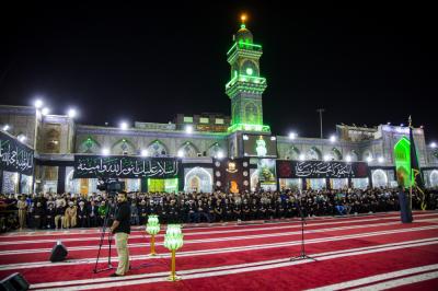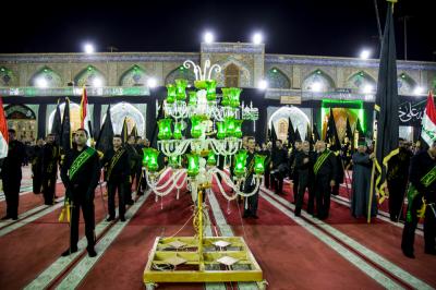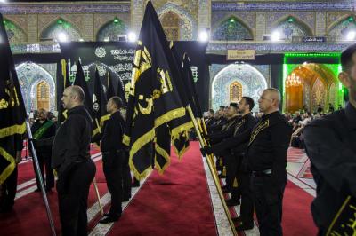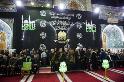 Au cours de la cérémonie, le secrétaire général du sanctuaire Al Kadimiya a reçu la bannière du seuil honorable du huitième imam ; Ali bin Musa al-Rida (que la paix soit sur lui).