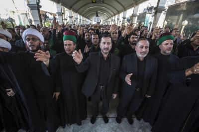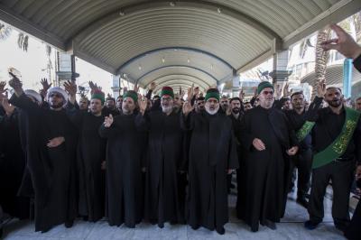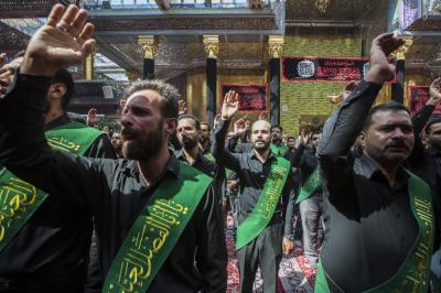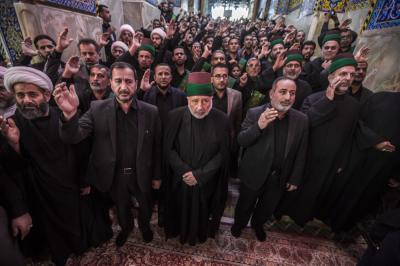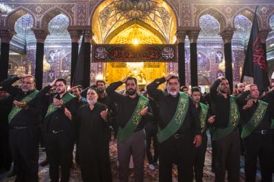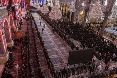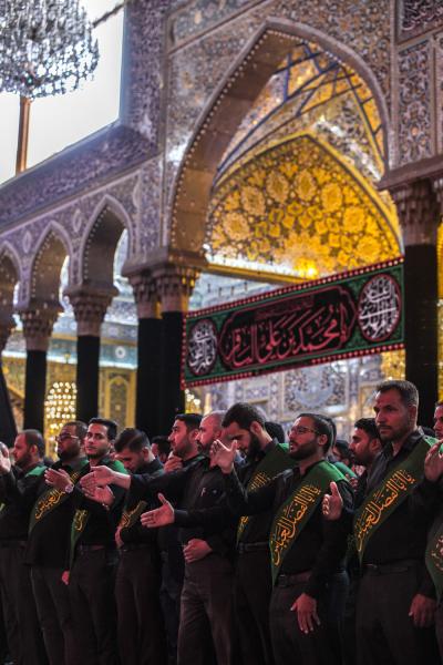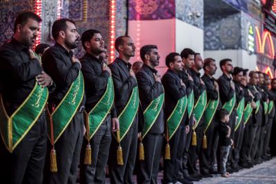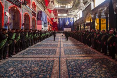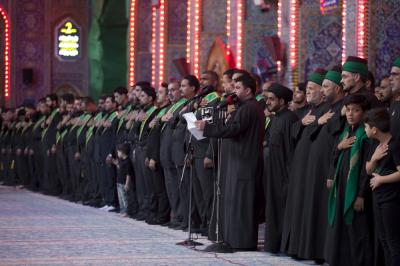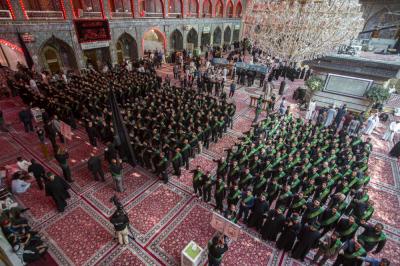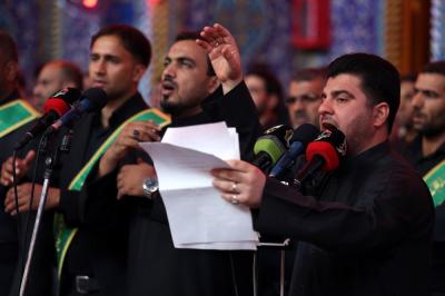 When they entered the holy sanctuary of the Master of the youth of Paradise; Imam al-Hussayn (peace be upon him), they were received by the servants of the holy shrine of Imam al-Hussayn (peace be upon him), a Council of condolences was then held in the Imam al-Hussayn's holy shrine, and elegies were chanted in reverence for this sad occasion, and during their procession march, the participants were chanting lamentations that embody the tragedy of the martyrdom of Imam al-Baqer (peace be upon him).