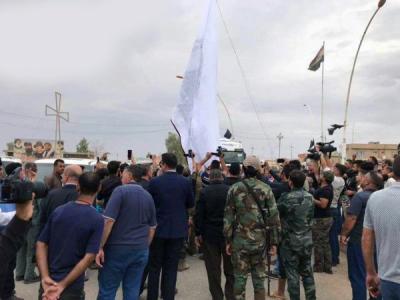 Ja, es sind die Bewohner Mosuls, Tal Afars, Ninawas und anderer Orte, die sich auf dem befinden und die Flagge des Haschd Asch-Schabi aus Dankbarkeit hochhalten.