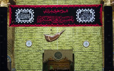 Le noir recouvre tous les murs du sanctuaire sacré d'Al-Abbas (p) pour annoncer le deuil de la commémoration du martyre de l'imam al-Hassan al-'Askari (la paix soit sur lui). Et des bannières de condoléances ont été suspendues à l'intérieur du sanctuaire sacré, exprimant la tristesse dans le cœur des croyants en cette occasion douloureuse pour Ahl al-Bayt (que la paix soit sur eux).