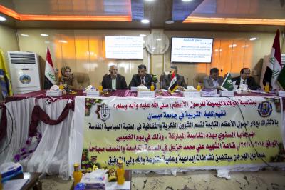 ابتدأت الفعّالياتُ التي أُقيمت في قاعة الشهيد علي محمد خزعل في كلية التربية بتلاوة آياتٍ من الذكر الحكيم وبعدها كانت هنالك وقفة إجلال لقراءة سورة الفاتحة ترحّماً على أرواح شهداء العراق الأبرار، ومن ثمّ استمع الحاضرون لعزف النشيد الوطنيّ العراقيّ ونشيد العتبة العبّاسية المقدّسة (لحن الإباء) ونشيد كلية التربية في جامعة ميسان، جاءت بعدها كلمةُ دار الرّسول الأعظم(صلّى الله عليه وآله) ألقاها بالنيابة الدكتور شعلان عبد علي سلطان، ممّا جاء فيها: