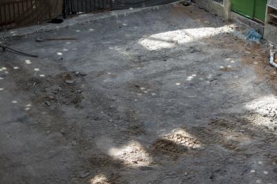 -Pouring concrete floor in preparation for cladding it with special concrete to help the adhesion to the old floor and to prevent moisture.