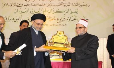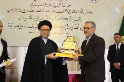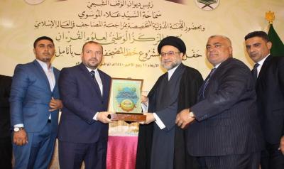 Auch machte er deutlich, dass das „Projekt der schriftlichen Verfassung des Heiligen Buches durch irakische Hände einem Traum glich, der nach langen Jahren Wirklichkeit wurde und das dank der außergewöhnlichen und ununterbrochenen Bemühungen, die die Leiter des nationalen Zentrums für Koranwissenschaften, darunter Leser, Auditoren und Artisten, sowie die Verwaltung des schiitischen Stiftungsdiwans, sowohl unter der damaligen Leitung von Sayed Saleh al-Haidari, als auch unter der jetzigen Leitung, geleistet wurden.“