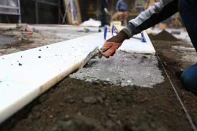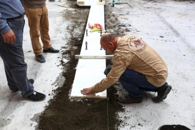 -Pouring concrete floor in preparation for cladding it with special concrete to help the adhesion to the old floor and to prevent moisture.
