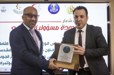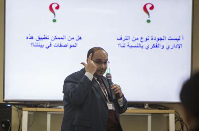 تلتها كلمةُ مدير شعبة الجودة في محافظة كربلاء ألقاها الأستاذ حيدر النصراوي وجاء فيها: "نجتمع اليوم بورشةٍ نأمل أن تكون فاتحة خيرٍ لغرس وترسيخ مبادئ وأسس إدارة الجودة الشاملة والتطوير المؤسّساتي".