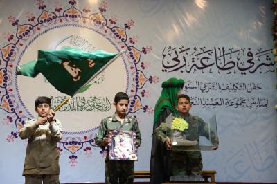 وفي ختام فقرات الحفل تمّ تكريم المتعلّمين المكلَّفين بالهدايا بعد أن ردّدوا (قَسَم التكليف).