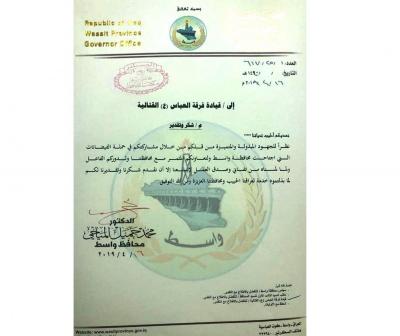 وبعد أن استقرّ الوضعُ الإنسانيّ في مدينتي واسط وميسان ودُرِئت العديد من المخاوف والأضرار وإبعاد شبح تعرّض بعض القرى الى الغرق، تقدّمت الحكومةُ المحلّية في محافظة واسط بشكرها وتقديرها إلى فرقة العبّاس(عليه السلام) القتاليّة، وذلك تثميناً لجهدها الكبير والواضح الذي بذلته ومساهمتها في درء أخطار الفيضانات واستقرار الأوضاع، وإبعاد مخاطر السيول التي تعرّضت لها محافظة واسط مؤخّراً .