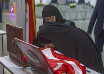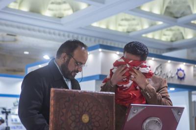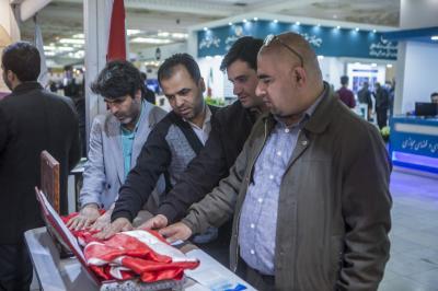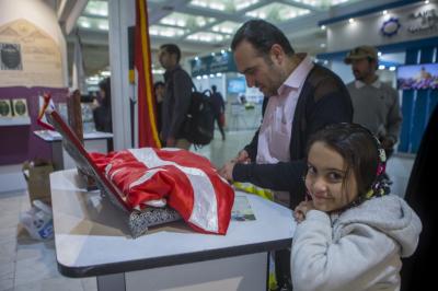 The flag of the dome of Aba al-Fadl al-Abbas (peace be upon him) was put in a box next to the box of the flag of the holy dome of Imam al-Hussayn (peace be upon him) inside the joint cultural pavilion of the holy shrines of Imam al-Hussayn and of al-Abbas (peace be upon both of them) at the Tehran International Book Fair.