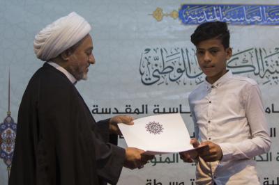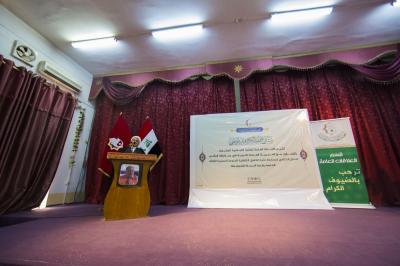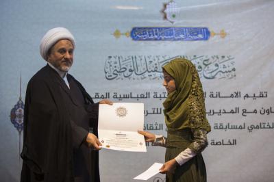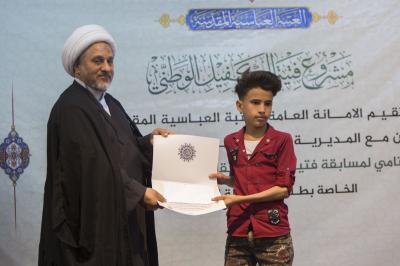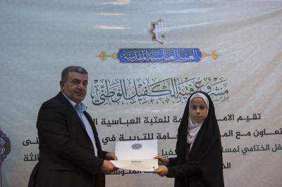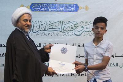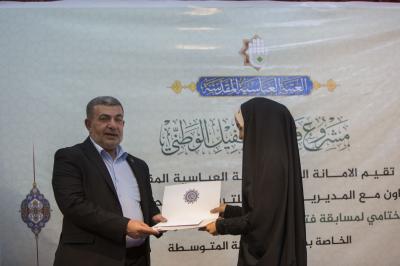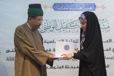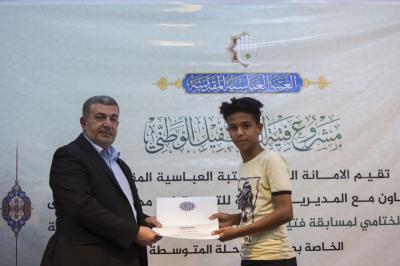 La cérémonie s’est déroulée dans la salle du regretté Ahmed Abdul Jassim à Samawah, avec la présence d’une délégation du sanctuaire saint Al Abbas et le directeur général de l’éducation Muthanna et le cadre de la direction réunissant des directeurs de département et professeurs, en plus des étudiants et leur parents, après la lecture des versets du saint Coran et la lecture de Sourate Al Fatiha à la mémoire des martyrs d’Irak et écouté l’hymne national et l’hymne du sanctuaire saint Al Abbas, a eu le mot du directeur général de l’éducation de la provine ; Mr Saad Khadir Al Richawi qui a remercié le sanctuaire saint Al Abbas pour son parrainage à ce concours culturel ».