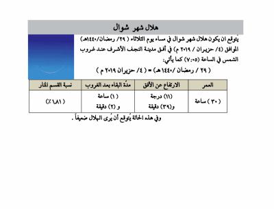 احتمالا هلال ماه شوال غروب روز سه شنبه 29 رمضان 1440 هجری مصادف با 4/6/2019 در نجف اشرف هنگام غروب آفتاب در ساعت 7:05 دقیقه مشاهده گردد.