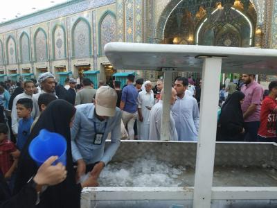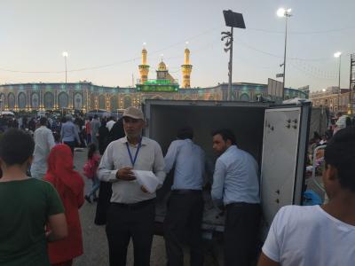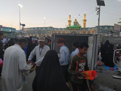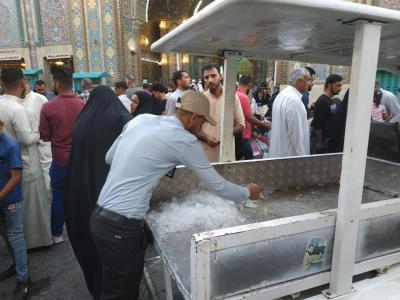 A son tour, la division de distribution d’eau au sanctuaire saint Al Abbas a pris en charge le transport de ces quantités de glaçons en utilisant des véhicules spéciaux vers les réservoirs d’eau situés dans la vieille ville, y compris le sanctuaire saint Al Abbas (p) et la zone entre les deux sanctuaires saints, les processions et comités de service qui servent les visiteurs, ainsi que la distribution directe sur les visiteurs.
